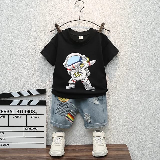 Whether for a family outing or a casual day at home, this t-shirt and pant set offers versatility. The trendy design complements any occasion, making it a must-have for your child’s summer wardrobe.